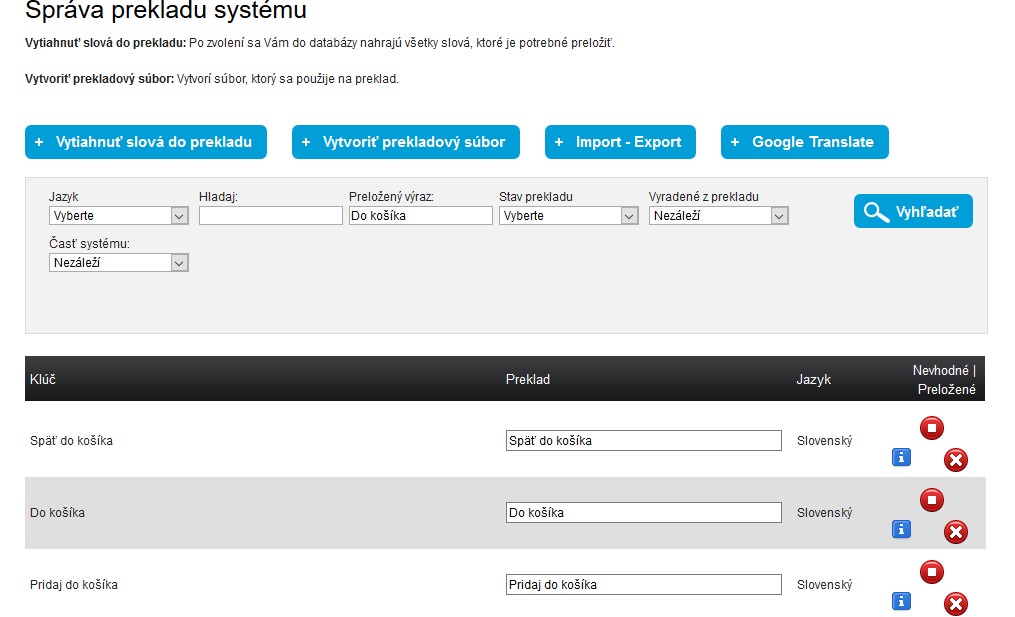 Úpravu prekladov textov použitých na stránke je možné robiť jednoducho pomocou administrácie.