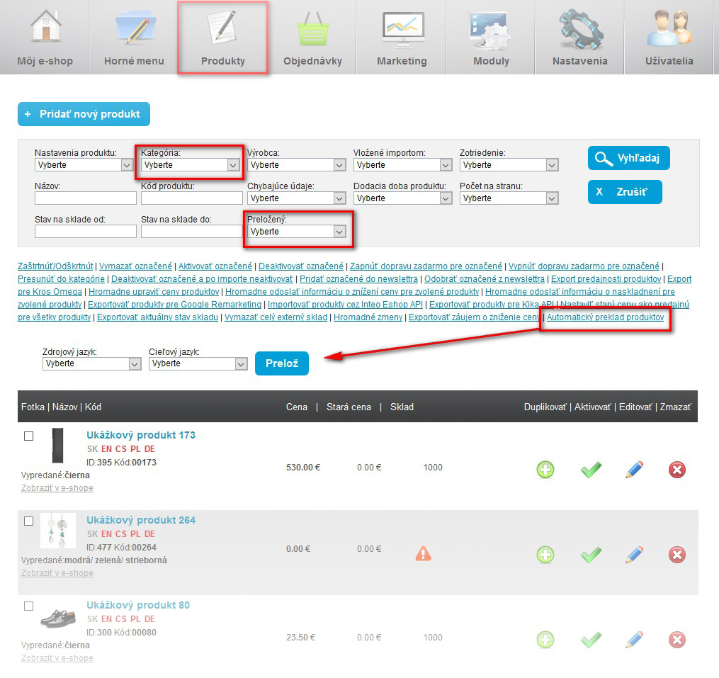 Preklad produktov je možné urobiť buď ručne zmenou jazyka v pätičke webu a prepísaním údajov, alebo preklad nechať na Google Translator API, čo Vám ušetri množtvo času.