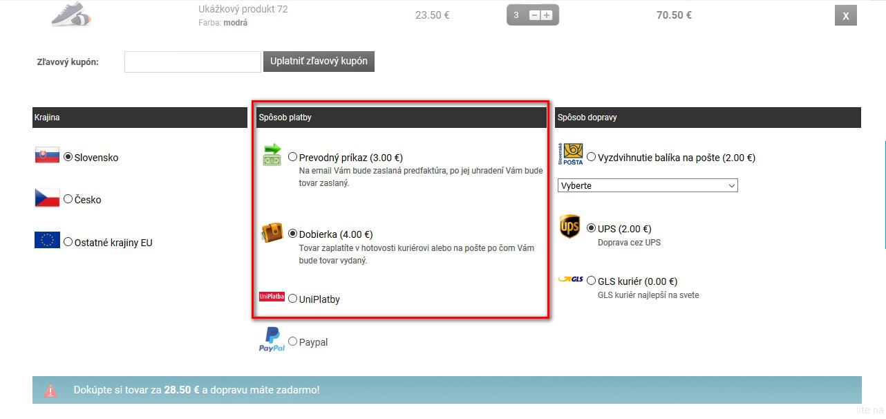Ak chcete zákazníkov motivovať k platbe za tovar prevodom a vyhnúť sa tak dobierkovým poplatkom, môžete spoplatniť aj spôsob úhrady (napr. dobierka za 1 €).