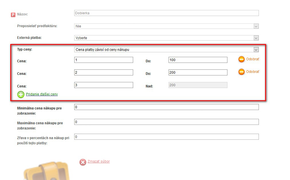 V prípade, že spoplatníte niektorú z platieb, môžete určiť, či jej cena bude stála alebo bude závisieť od výšky nákupu.