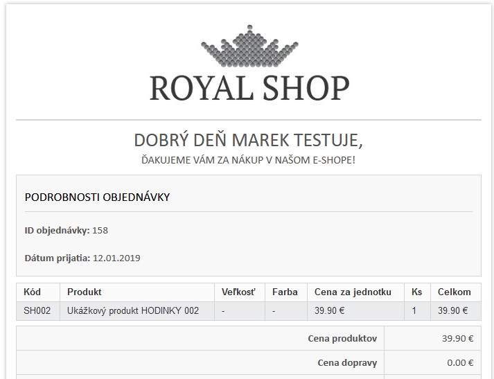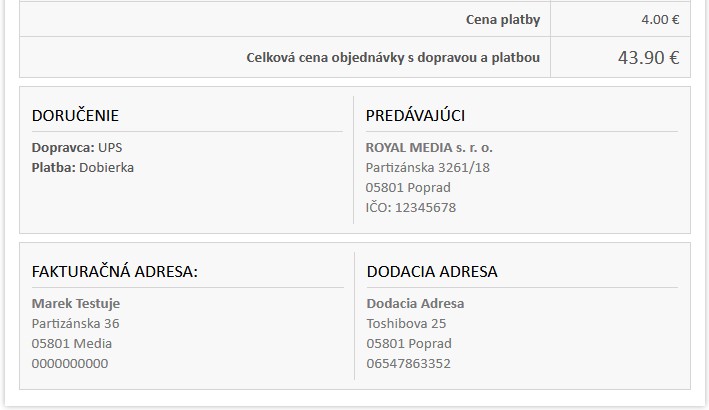 Každý zákazník po objednávke automaticky dostane zo systému informačný e-mail s ID jeho objednávky a prislúchajúcimi informáciami. Jeho súčasťou sú aj dokumenty, ktoré vyžaduje slovenská legislatíva.