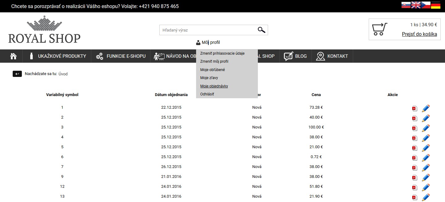 Registrovaný zákazník má k dispozícii sekciu Môj profil, kde vidí históriu svojich objednávok, ako aj ich statusy. Môže si tu upravovať svoje údaje alebo zmeniť heslo.