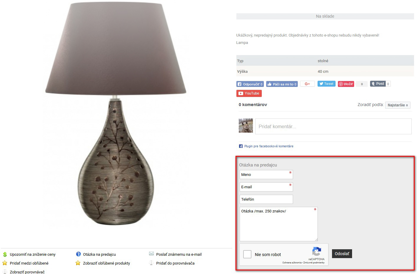 Pomocou formulára v detaile produktu môže používateľ jednoducho poslať otázku, ktorá Vám príde e-mailom spolu s jeho kontaktnými údajmi.