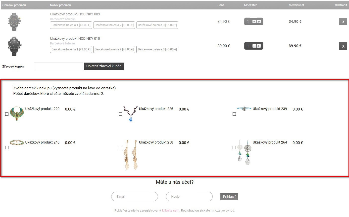 Tento modul sa nachádza v košíku, je možné ho zapínať/vypínať a zároveň definovať cenu nákupu, od ktorej budú zákazníkovi ponúknuté darčeky. Je možné určiť aj ich počet.
