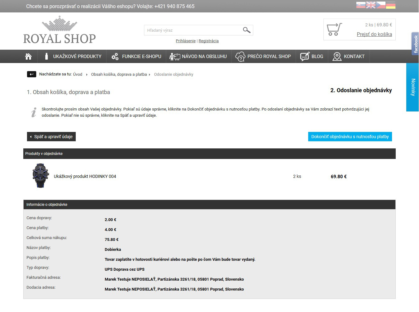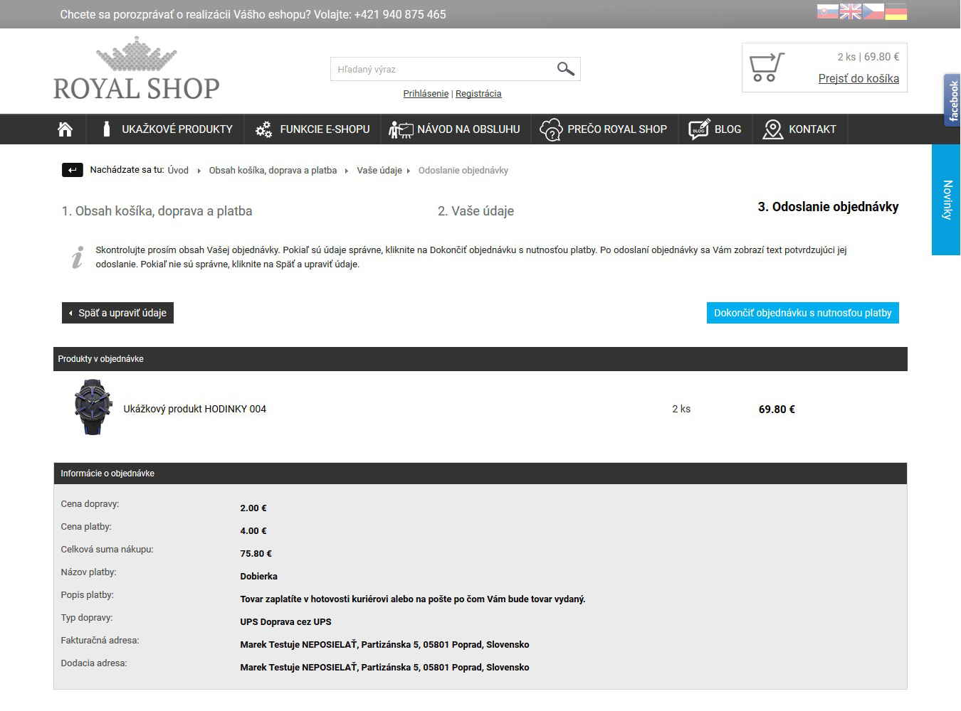 Nasleduje poďakovanie za odoslanie objednávky, pričom je zákazníkovi odoslaný aj e-mail s potvrdením jej prijatia.