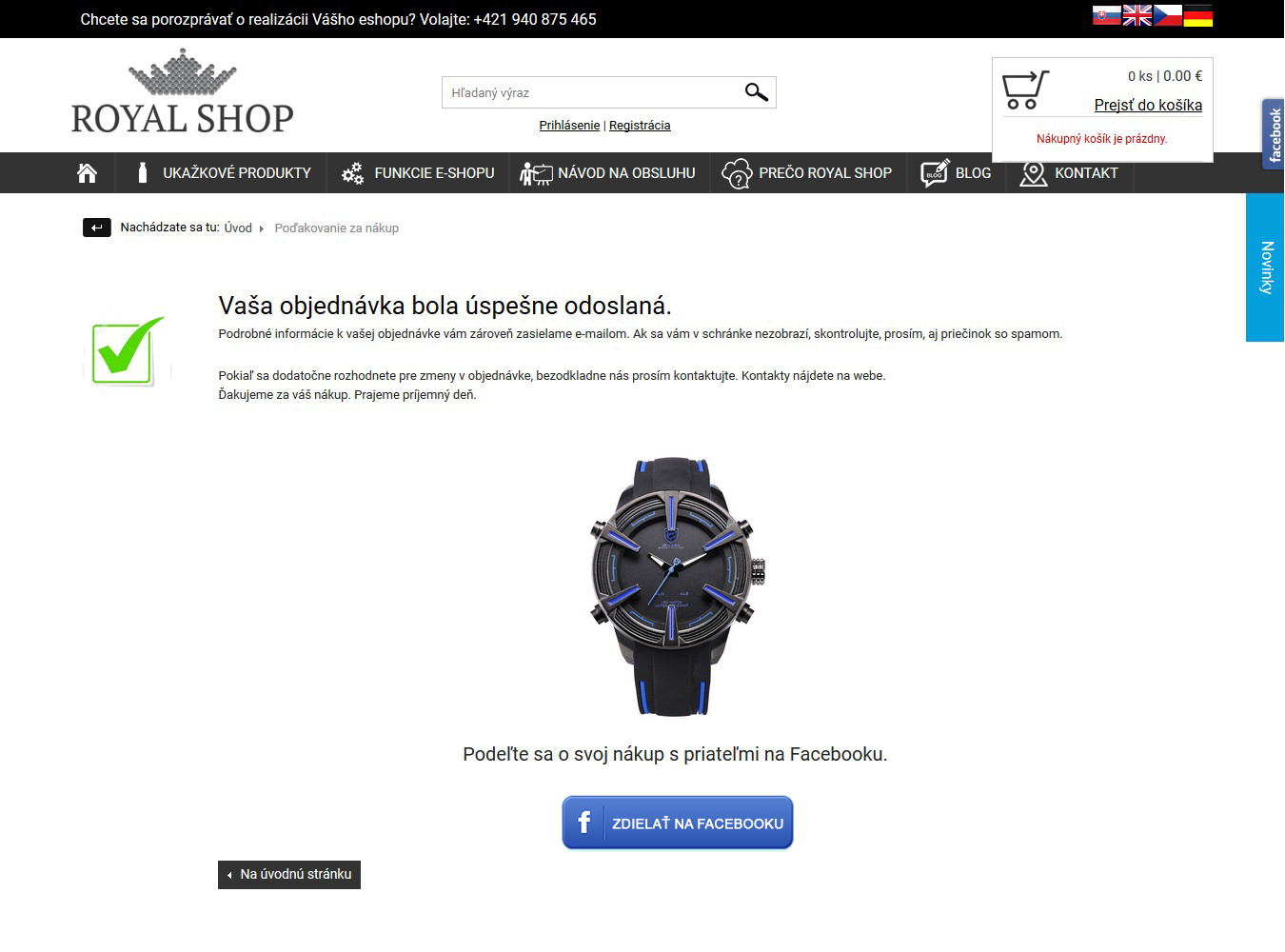 Možnosť po objednávke zdieľať objednaný produkt na Facebooku