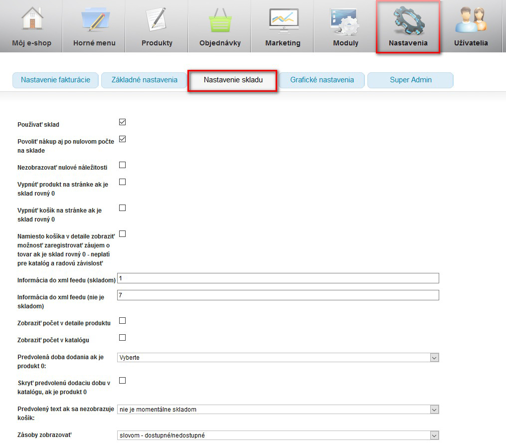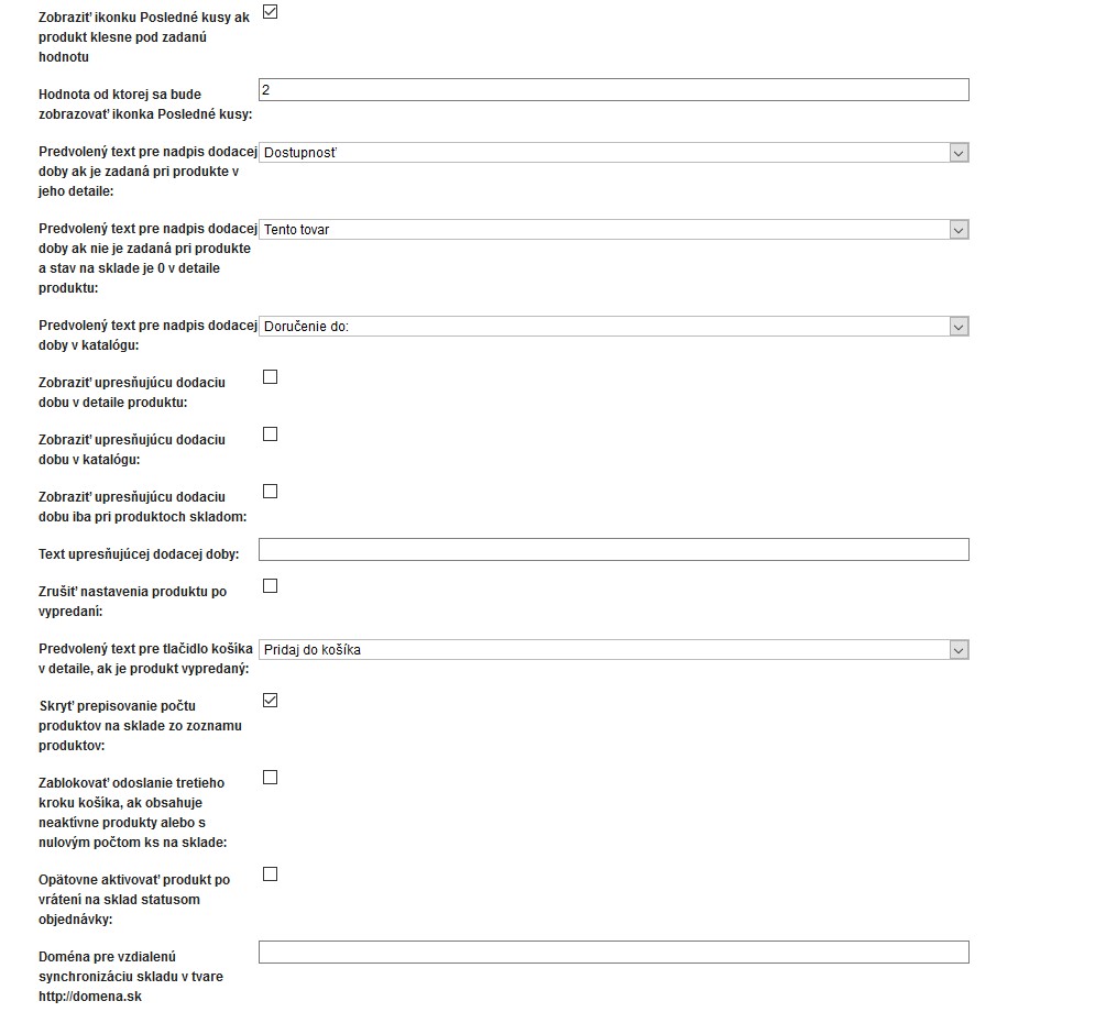 Pomocou administrácie si môžete zapnúť/vypnúť sklad. Ak ho používate, dokážete jednoducho konfigurovať jeho vlastnosti, spomedzi ktorých vyberáme napr.: